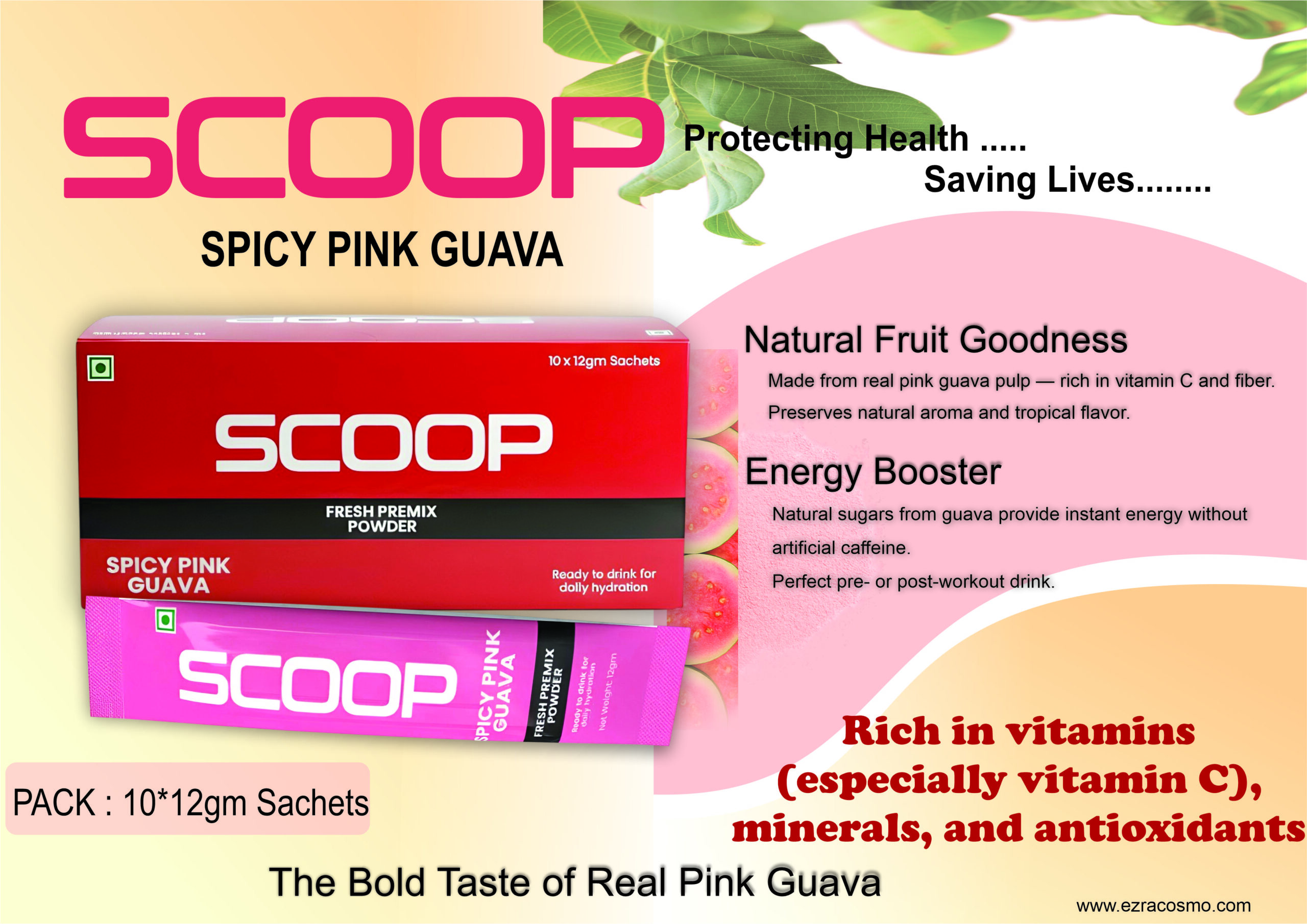 SCOOP Spicy Pink Guava Fresh Premix Powder — is a refreshing, tangy drink mix that combines the sweetness of pink guava with a hint of spice for a bold and flavorful hydration experience.